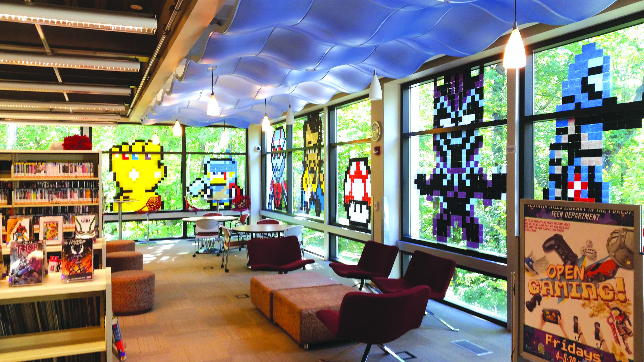 Welcome to the Teen Department at the Vestvia Hills Library in the Forest! This area is designed for students in grades 6-12 and collects all of the books, comics, manga, graphic novels, movies, TV shows, music and video games you could possibly want or need … usually! We host fun events on most Tuesdays, Wednesdays, and Fridays, ranging from writing groups and craft events to video game tournaments and fandom nights. Whatever you like we have something for you!